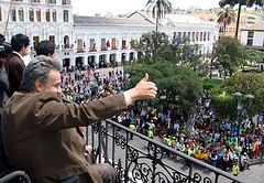 El Presidente Lenín Moreno saluda desde el Palacio de Carondelet a los cientos de simpatizantes congregados en la Plaza Grande
