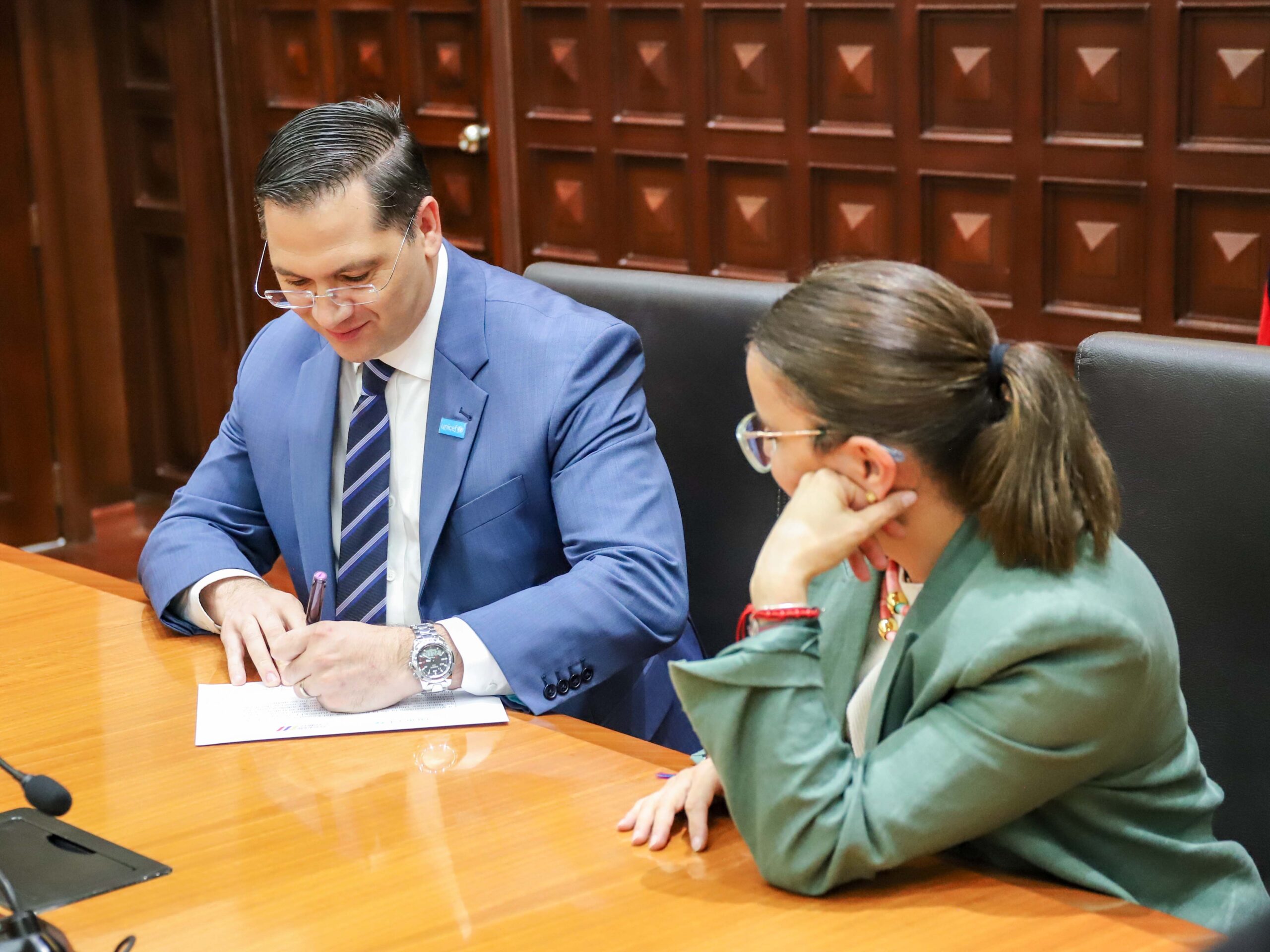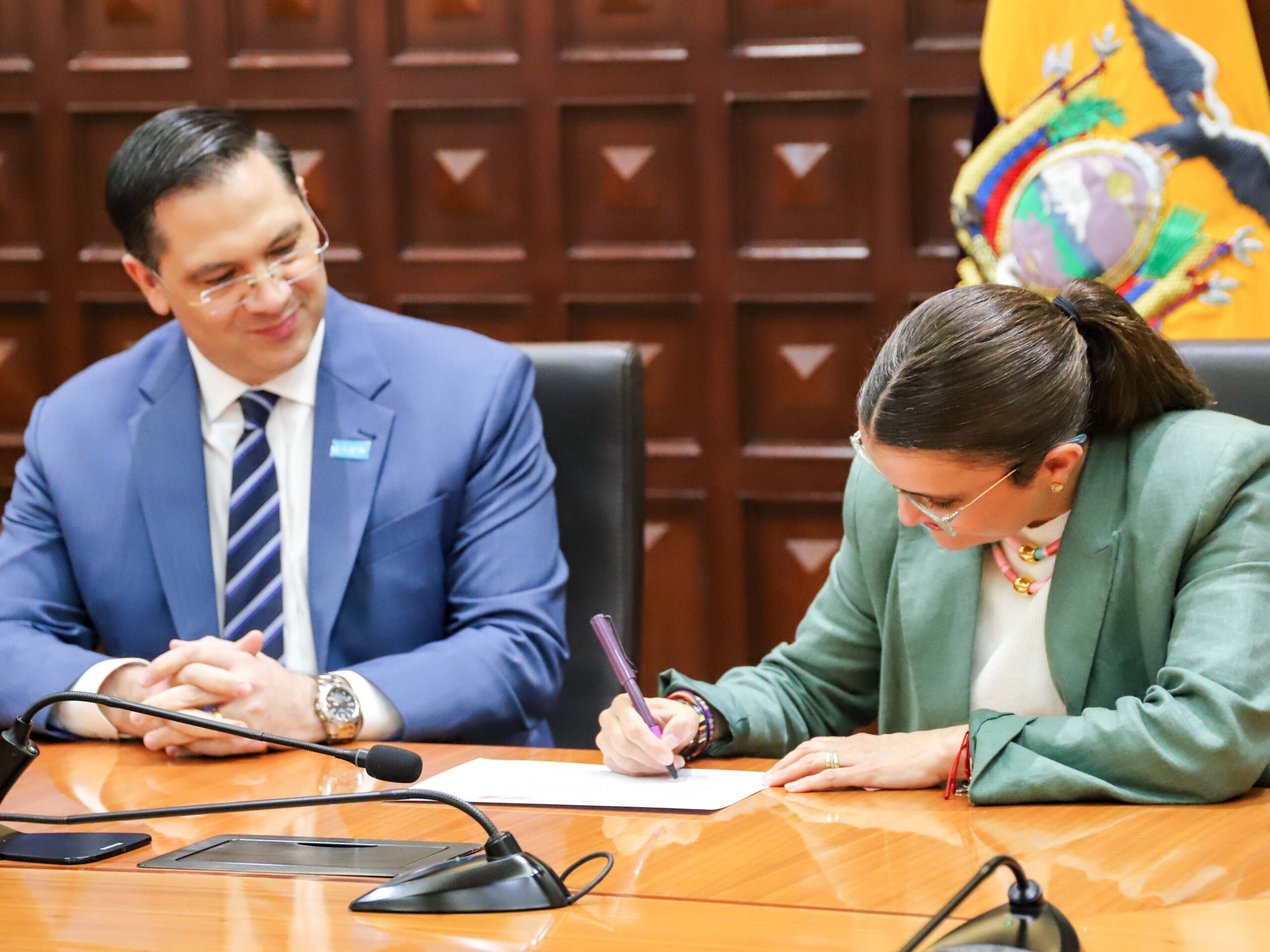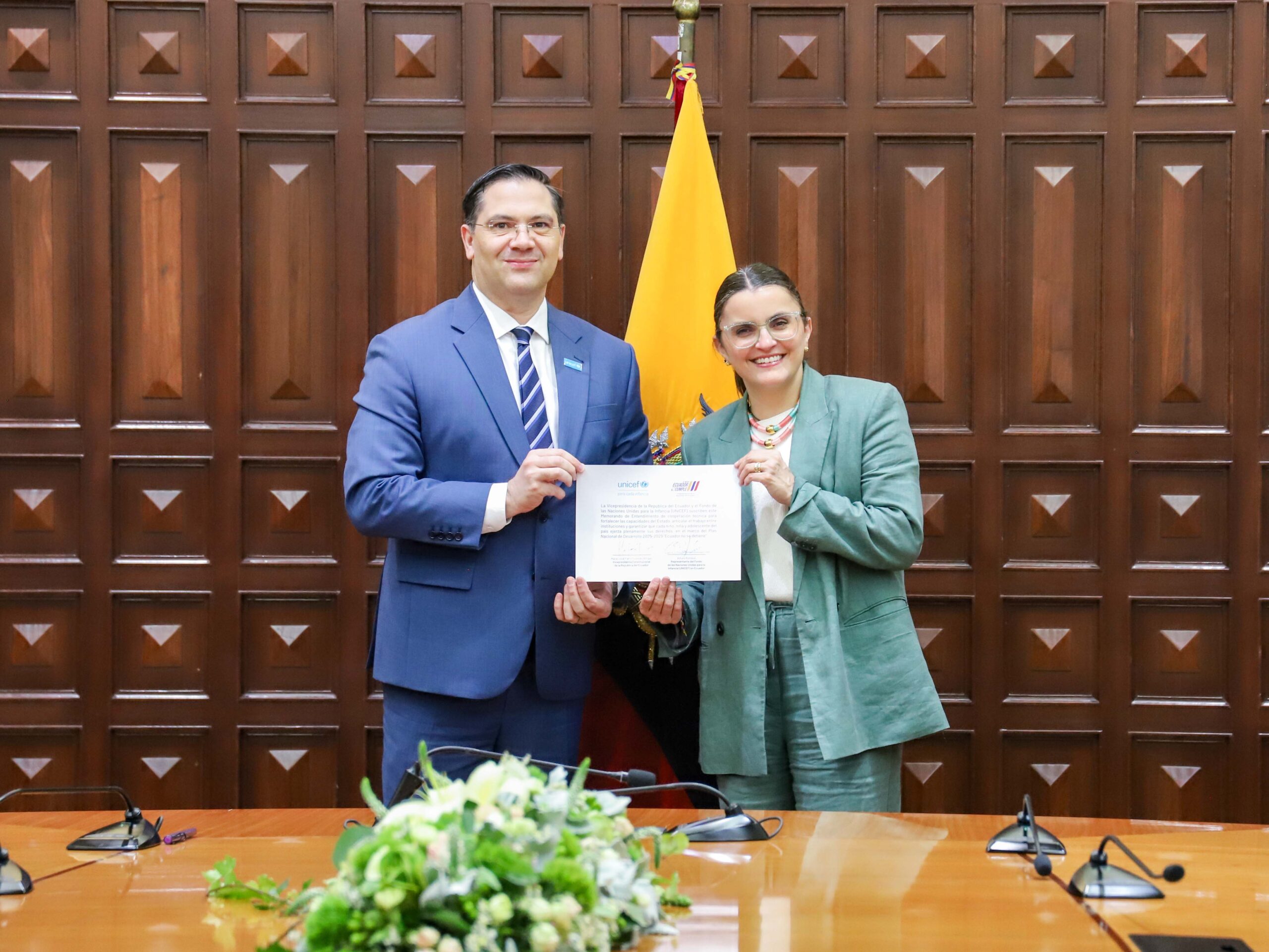 La Vicepresidenta de la República, María José Pinto, y el representante de UNICEF en Ecuador, Arturo Romboli, suscribieron este jueves un Memorando de Entendimiento de cooperación técnica que marca un nuevo hito en el fortalecimiento de la institucionalidad estatal y la articulación interinstitucional en favor de las niñas y niños del país.